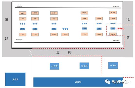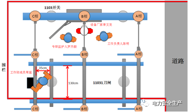 110kV#3主变变高1103开关机构A修工作地点围栏布置情况(虚红线为围栏标识)
