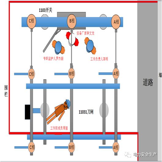 12时03分,工作人员周某解开#3主变变高1103开关至11031刀闸导线开关侧接线板并用绳子绑扎固定后,扩大工作范围,从1103B0地刀操作机构沿着刀闸水泥支柱与刀闸底座间的空隙往上爬,爬到构架后,左脚站在刀闸支柱柱头板,右脚跨向刀闸底座槽钢,在起身过程中,为保持身体平衡,左手伸出,与11031刀闸C相母线侧金属帽距离不足放电,电弧造成周某颜面、左上肢、躯干、右下肢局部灼伤,并从构架跌落至地上。