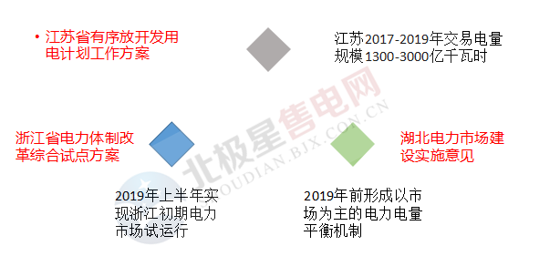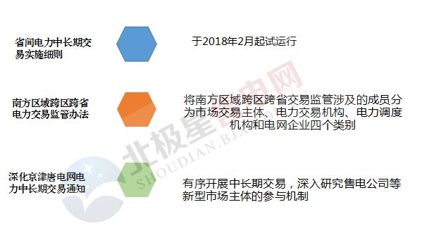 《内蒙古东部地区电力中长期交易规则》印发:电力用户可按全电量参与市场交易 现阶段,参与直接交易的电力用户可按全电量或者用电量的一定比例参与市场交易,根据蒙东发用电计划放开逐步扩展至全电量参与,逐步取消目录电价。参与直接交易的电力用户不得随意退出市场。 《黑龙江省电力中长期交易规则》印发:适时启动黑龙江电力现货市场建设 待条件成熟后,适时启动黑龙江电力现货市场建设,建立以电力中长期交易和现货交易相结合的市场化电力电量平衡机制。 《吉林省电力中长期交易规则》印发:适用于吉林省合同电量转让交易 现阶段,吉林省电力中长期交易主要开展年度交易、月度(季度)交易。拥有优先发电合同、基数电量合同、直接交易合同、跨省跨区交易合同等的发电企业可以参与合同转让交易。 云南电力市场中长期交易实施细则印发:3%以内免偏差电费 通知中明确指出电力用户准入条件是10千伏及以上电压等级电力用户,鼓励优先购电的企业和电力用户自愿进入市场。其次,云南对于独立辅助服务提供者鼓励电储能设备、需求侧(如可中断负荷)等尝试参与。市场主体进入市场后又自愿退出市场的或被强制退出的,3年内不得参与电力市场交易。 北极星售电网注意到,此次印发的细则照比之前在2017年3月13日下发的云南电力市场中长期交易实施细则(征求意见稿)间隔了十个月的时间。细则中规定,交易品种包括电力直接交易(含跨境电量交易,下同)、跨省跨区电量交易、合约电量转让交易,以及辅助服务(交易)机制等。具备条件时可开展分时(如峰谷平)电量交易,鼓励双边协商交易约定电力交易(调度)曲线。 合约电量偏差首先由市场主体通过事后合约转让交易解决,事后合约转让交易后还有少发电量的,按月度上、下调服务和偏差电量结算机制处理。3%以内的部分免除偏差电费。 本实施细则自公布之日起实施,有效期至2019年12月31日。 山西执行电力中长期交易规则有关事宜发布:8种情况免考核 2%以外的少发用电量需要支付偏差考核费用,有8种情况经认定可免除直接参与电力交易的市场主体偏差考核。 河北南部电网电力中长期交易规则发布:银行履约保函额度200万起步 规则适用于河北南部电网现阶段开展的电力直接交易、跨省跨区交易、合同电量转让交易、抽水电呈招标采购交易等。适时启动电力现货市场建设,建立以电力中长期交易和现货交易相结合的市场化电力电量平衡机制。 通知中称,售电公司暂不能代理发电企业参与直接交易。 建立售电公司履约保函制度,待执行电量超过30亿千瓦时的售电公司,暂需提供不低于2000万元人民币的银行履约保函;超过6亿千瓦时的售电公司,需提供不低于500万人民币的保函。低于6亿千瓦时,需提供不低于200万人民币的保函。同时,建立售电公司信用评价体系,按照信用程度,调整银行履约保函额度。 湖南省电力中长期交易实施细则(2018年01版)发布 湖南电力交易中心日前发布了《湖南省电力中长期交易实施细则(2018年01版),本次是对2017年9月发布的《湖南省电力中长期交易实施细则(试行)进行了修订。 湖南省电力中长期交易规则修改增补条款 《湖南省电力中长期交易规则修改增补条款(第一次)》,通知中称,经广泛征求意见,对《湖南省电力中长期交易规则(试行)》部分条款内容进行了修改,并增补了相关条款,共有14个条款改动。 电力市场规划: 在电力市场规划方面,江苏、浙江先后发布了文件,江苏2017-2019年交易电量规模1300-3000亿千瓦时,浙江2019年上半年实现浙江初期电力市场试运行。湖北在2019年前形成以市场为主的电力电量平衡机制。 《江苏省有序放开发用电计划工作方案》:2017-2019年交易电量规模1300-3000亿千瓦时 预计江苏2020年全省社会用电量为6500亿千瓦时,优先购电电量2400亿千瓦时左右。 江苏有序放开发用电计划步骤分三步走: 第一阶段(2017-2019年):放开竞争性环节电量30%-80%,交易电量规模达到1300-3000亿千瓦时。参与交易的30万千瓦及以上燃煤机组平均市场化电量占比达到40%-80%,核电机组市场化电量占比达到20%-50%。 第二阶段(2020年),取消竞争性环节发电计划,推动优先发电计划逐步市场化,交易电量规模达到4000亿千瓦时。放开13.5万千瓦以上燃煤机组全部发电量计划,核电机组市场化电量占比达到60%,跨省跨区送电中的市场化交易电量700亿千瓦时。 第三阶段(2021年-),逐步放开优先发电、优先购电计划,完善辅助服务交易机制,基本放开除优先购电权以外的所有用电量。 江苏省电力市场建设组织实施方案:售电公司可视同大用户与发电企业开展电力直接交易 结合江苏省电力行业实际和改革实践,市场化改革初期以中长期交易为主,随着发用电计划的逐步放开,不断完善月度合同电量转让、日前现货市场和实时平衡市场交易机制,提高市场偏差处理和负荷实时平衡能力,开展辅助服务交易,推进江苏省电力市场建设不断深入和完善。 第一阶段(2017年-2019年):有序放开发用电计划、竞争性环节电价和配售电业务,开展现货市场研究及模拟运行,初步建立电力市场机制。2018年放开发电量计划2000亿千瓦时左右,参与交易的13.5万千瓦以及上燃煤机组平均市场化电量占比达到60%。2019年,放开发电量计划3000亿千瓦时左右,参与交易的13.5万千瓦及以上燃煤机组平均市场化电量占比达到80%。 售电