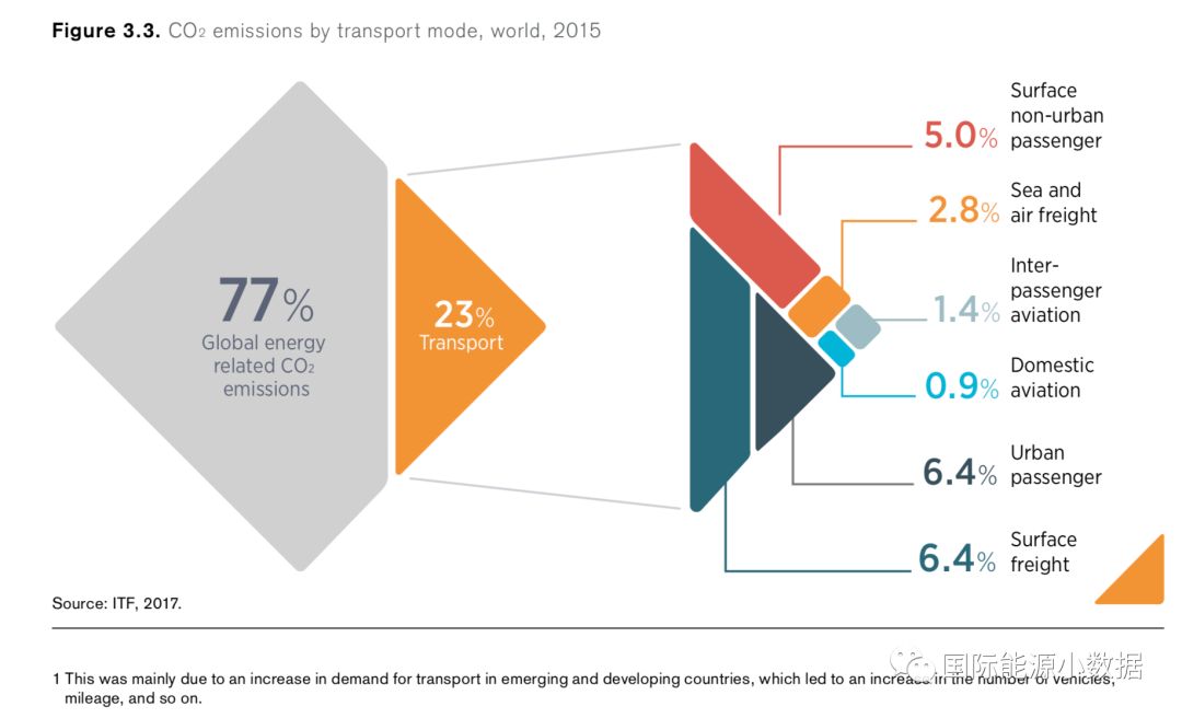 从碳排放的角度看,在2015年全球能源相关的碳排放中,23%来自交通部门(包括城市小客车6.4%、地面货运6.4%、城市以外的地面客车5.0%、海运与空运2.8%、国际空中客运1.4%、国内空中客运)。