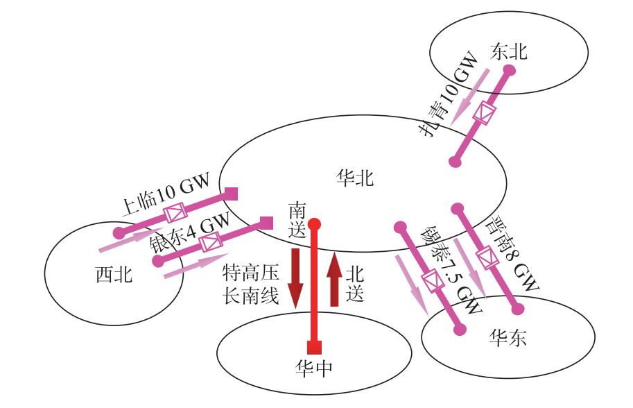 图1 华北与其他电网特高压交直流互联网+架示意图