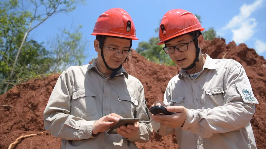 浙江长龙山抽水蓄能电站500kV送出工程现场,工作人员在调试北斗手持终端。