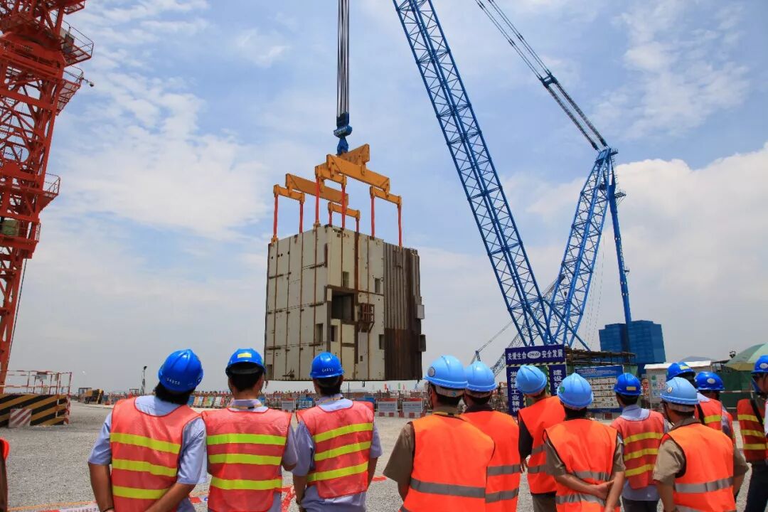 6月,三门1号机组核岛建设迎来了另一个挑战——最大的结构模块CA20模块吊装就位。该模块高20多米,起吊重量达到968吨,相当于900多辆小汽车的重量。吊装启用了当时世界上起重能力最大的履带式起重机-LTL2600B大吊车。CA20模块是核电厂结构模块“工厂化预制、现场拼装、组焊、吊装”的典型代表,它的成功就位开启了我国核电站工程建设进入模块化建造新时代的帷幕,为我国后续核电站工程大规模使用模块化建设积累了宝贵经验。