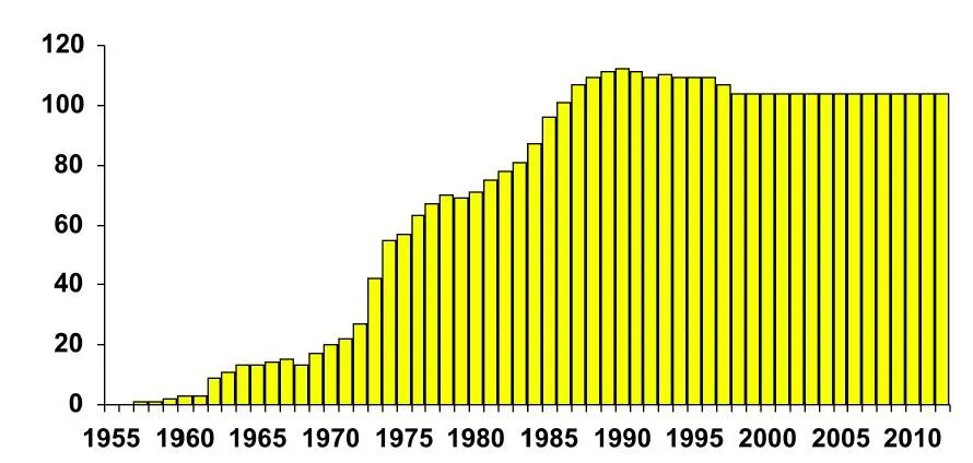 尽管如此,得益于在1965—1975年“黄金十年”的高速发展,美国奠定了在世界核电行业的霸主地位,时至今日核电运行机组数量仍然超过100台,长期高居世界第一。