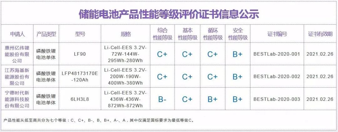根据储能电池产品性能等级评价证书信息公示,被业内公认产品质量最好的宁德时代储能电池综合性能评级才达到B-。