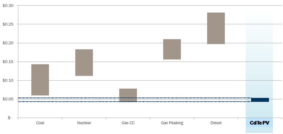平价上网不只是组件和系统成本,最终要算全运行周期度电成本。碲化镉目前做到什么水平?2015年最低的上网报价是内华达州的3.87美分,即0.28元人民币/千瓦时,现在度电的水平在6美分到4美分每度的范围,可以和煤电、燃气发电竞争抗衡了,到这个水平就算得上是平价上网了,已经和传统电力成本相当的。这是在集中式地面电站的数据。