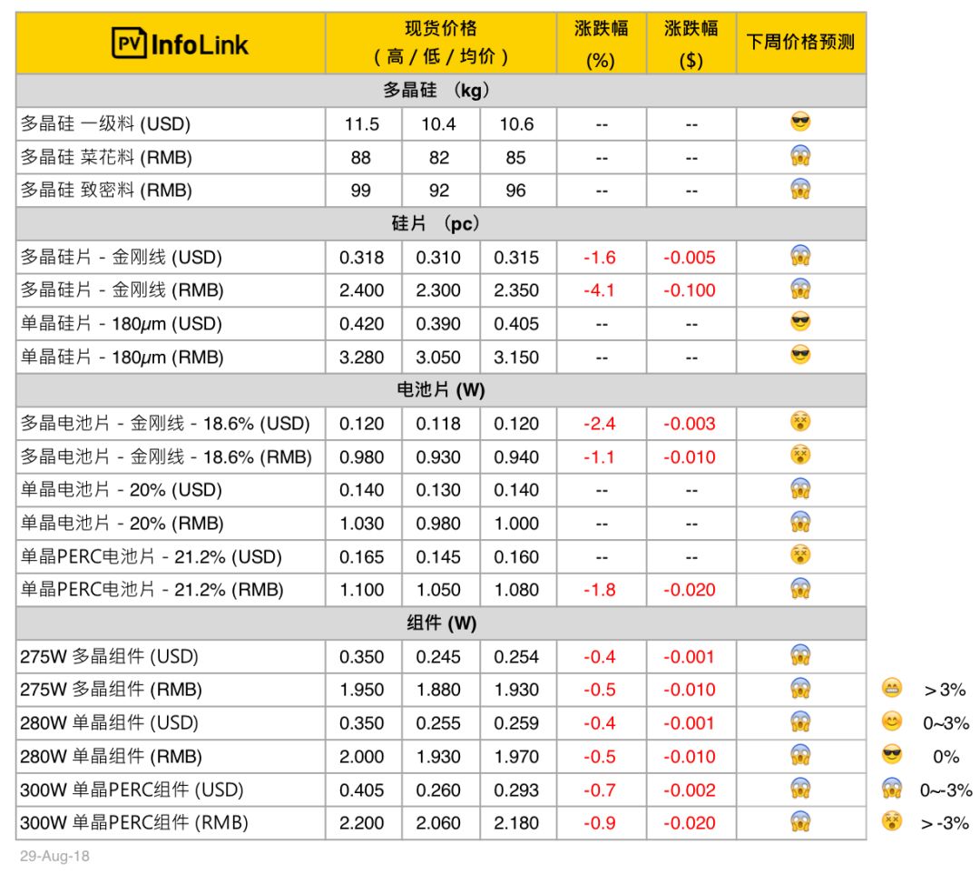 根据PVinfoLink的统计数据,本周各环节的价格如下表所示。