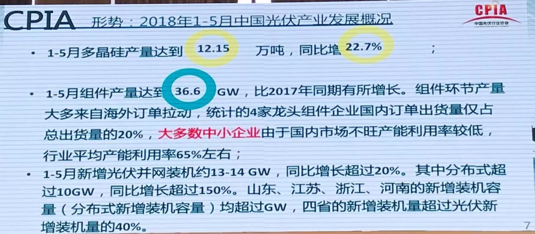 截止,1-5月份多晶硅产量达到12.15万吨,同比22.7%;1-5月组件产量达至36.6GW,比2017年同期有所增长。