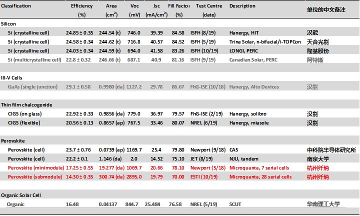 2019年太阳电池中国最高效率表