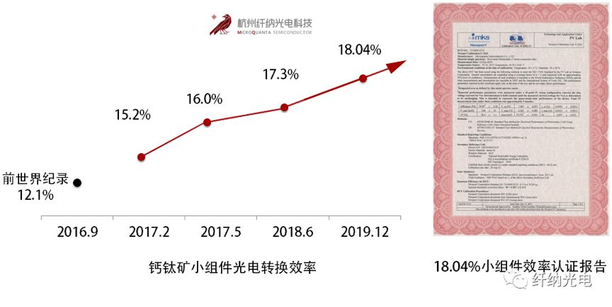 在单层钙钛矿技术量产方面,虽然国内外企业均起步不久,但我国企业已屡破世界纪录,其中,仅纤纳光电一家公司就五次刷新了钙钛矿组件转换效率的世界纪录。2019年12月,纤纳光电宣布,其自主研发的钙钛矿小组件效率又创新高,在面积为19.276cm²的小组件上,光电转换效率突破18%,刷新了由其保持的世界最高效率。短短3年,纤纳光电将钙钛矿小组件效率提升了6个百分点。