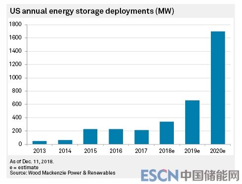 调研机构Wood Mackenzie Power&Renewables估计,美国的储能部署在经历了三年的发展持平甚至负增长后,在2018年增长了57%,装机容量达到338MW,而积压的订单则表明,2019年将增加约660MW,2020年为1,700MW,到2023年超过3,850MW。