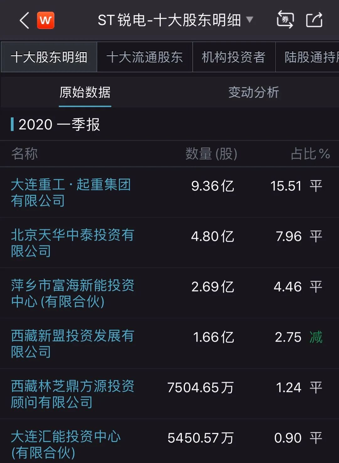 一季报显示,华锐风电的股东列表包括大连重工·起重集团、北京天华中泰投资有限公司、萍乡富海新能投资中心、西藏新盟投资发展有限公司、西藏林芝鼎方源投资顾问有限公司、大连汇能投资中心等。