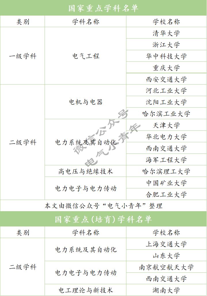 电气工程一级国家重点学科全国仅有五所高校,分别为:清华大学、浙江大学、华中科技大学、重庆大学、西安交通大学。也反应了这五所高校的综合实力都非常强。电气工程二级国家重点学科和国家重点(培育)学科全国仅有14所高校,均为电气工程一流院校。