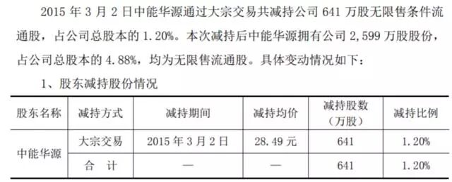 2015年3月,中能华源再次通过大宗交易共减持清新环境641万股无限售条件流通股,占后者总股本的1.20%;减持均价为28.49元,折算为中能华源套现1.826亿元。中能华源称转让股份目的为“在支持国电清新激励员工持股计划的同时解决自身经营发展的资金需要”,此次减持后中能华源对清新环境持股比例降至4.88%。
