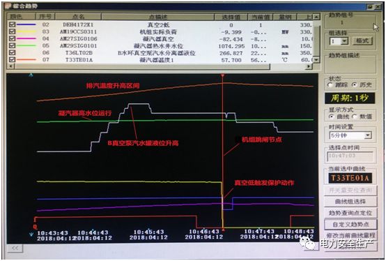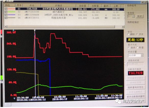 2018年4月12日10时46分,机组负荷100MW,2A、2B、2C磨煤机和AB层1、2号角小油枪运行;主汽温度487℃,压力6.6MPa;再热温度477℃,压力1.1MPa;凝汽器水位1070mm,2B、2C真空泵运行。