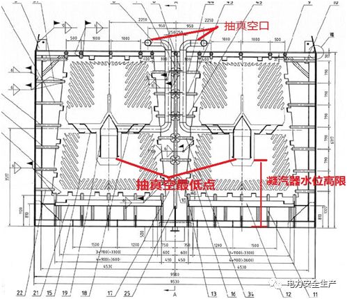 查阅凝汽器图纸,如图1所示。水位计的零点为凝汽器底板,最大测量量程为1100mm,凝汽器真空吸入腔室最低点距离凝汽器底板2571mm,即真空泵吸入口距离凝汽器可视最高水位高约1471mm,考虑芯管影响,核算水量增加约60吨就能淹没真空泵的吸入口。
