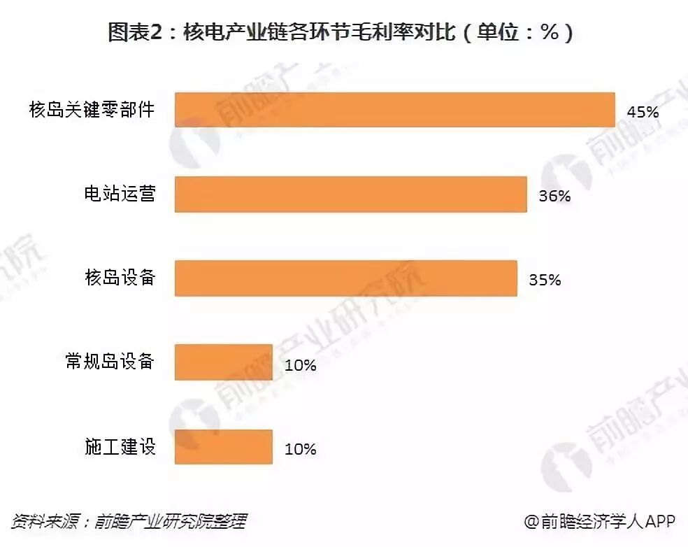 从产业链的毛利率来看,核电设备的毛利率也高于其他环节。其中,核岛关键零部件的利润率最高,达45%左右。
