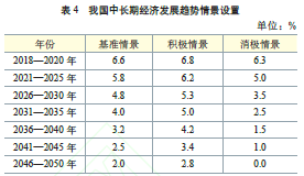 未来我国经济将延续新常态以来增速放缓的趋势,但增速放缓的幅度和速度就取决于改革和创新带来的全要素生产率提升和经济潜力释放的情况。本文分基准、积极及消极三种情景来模拟未来我国经济的发展趋势。其中基准情景通过宏观经济模型预测得出。宏观经济模型是基于需求导向的凯恩斯宏观经济框架,以联立方程组模型为基础结构,行为方程采用协整理论和误差修正模型构建,包括居民收入、居民消费、投资、进出口、财政收支、货币信贷以及价格指数等7大模块。