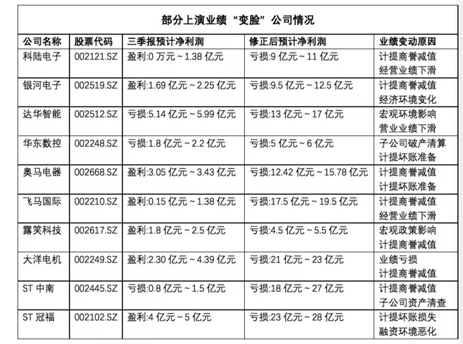 同样受到子公司业绩影响变脸的还有科陆电子。根据科陆电子发布的业绩预告修正公告,公司此前预计2018年度净利变动区间为0万元~1.38亿元,同比下降70%至100%。修正后,预计净利亏损9亿~11亿元。
