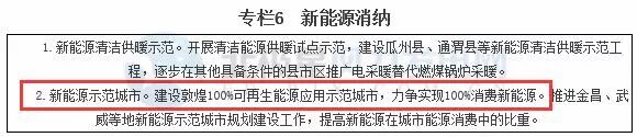 7.创建高比例新能源示范城市。率先在敦煌市创建高比例新能源示范城市。探索在一个城市整体实现城市能源转型,形成以局域智能电网为基础,风电光电互补、光伏光热协同、多种能源融合发展的能源产消格局,建成100%可再生能源电力城市、可再生能源供热城市、可再生能源公共交通城市。