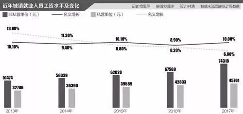 不过,统计数据显示,国企职工的年平均工资,过去三年仍保持两位数增长。招商证券宏观分析师谢亚轩、高明等据国家统计局数据算得,2017年末全部城镇单位就业人员平均工资为7.4万,近三年分别增长10.1%、8.9%、10.0%;而国有企业就业人员年平均工资为8.1万元,近三年分别增长14.0%、11.1%、11.8%,直观上存在水平过高、增长过快的情况。