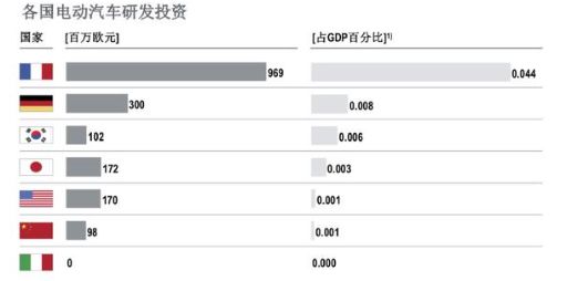 在技术层面,排名最后的两位是中国和意大利。从研发支持角度来看差距尤为突出,中国电动汽车研发投资仅为9800万欧元,对比研发投资金额最高的法国,简直云泥之别。