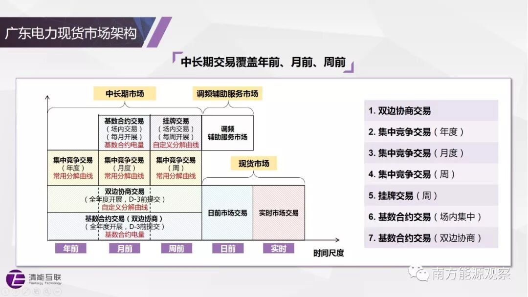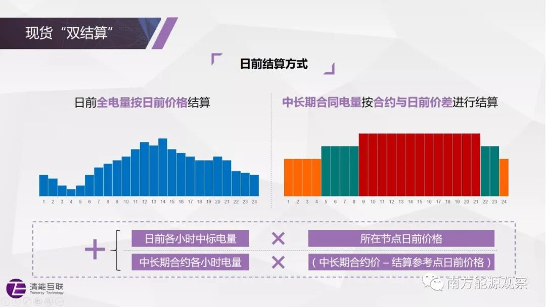 南方(以广东起步)现货市场采用双结算:日前市场中标量按日前现货价格结算;实时市场中,与日前市场中标量相比,实际多发(少用)的电量将以实时市场价格卖出,少发(多用)的电量将以实时市场价格买入,不再进行额外的惩罚;中长期合约和基数电量根据日前市场价格进行差价结算,起到锁定交易电量价格的作用。