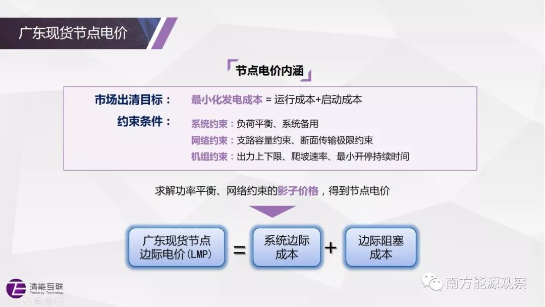 南方(以广东起步)现货市场的节点电价将由系统电能价格和阻塞价格构成。系统电能价格反映全市场的电力供需情况,阻塞价格反映节点所在位置的电网阻塞情况。当网络传输出现阻塞时,市场将会“拆分”为多个分区,使得不同地理位置的边际价格产生差异,偏离“无网络约束”状态下的边际机组申报价格。节点电价的内在机理非常复杂,一般而言,负荷大小和分布、发电侧报价、发电机组物理参数、网络传输能力是影响节点电价的主要因素。因此,市场主体在参与现货市场申报时,需要结合市场运营机构公布的运行信息进行分析决策。