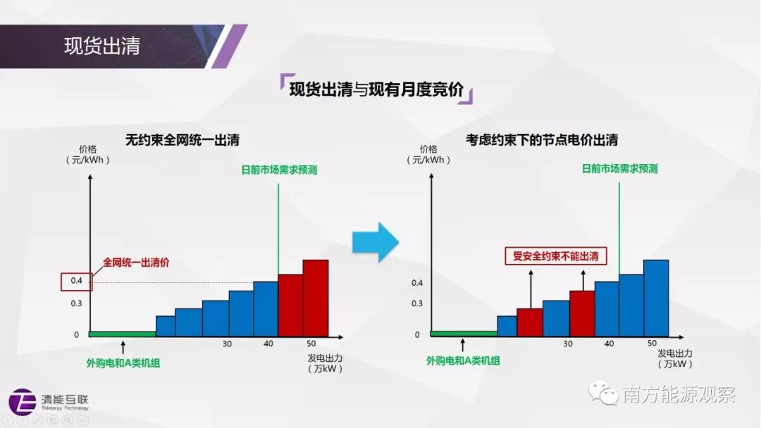 而现货市场出清将考虑系统负荷平衡、机组物理参数、电网运行安全等多方面的约束条件,影响出清的因素更多、内在机理更为复杂。现货市场采用节点电价机制,出清价格与网络阻塞情况密切相关,不能简单的根据供需曲线的交点得出。