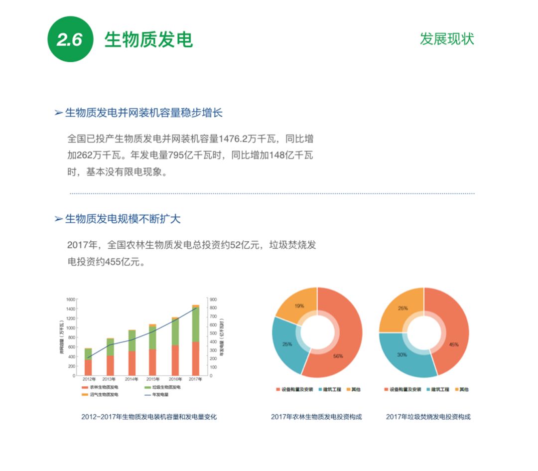 在生物质发电方面,2017年我国装机容量已达1476.2万千瓦,新增262万千瓦。