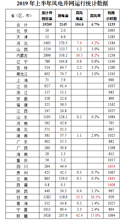 2019年1-6月,弃风仍较为严重的地区是新疆(弃风率17.0%、弃风电量42.4亿千瓦时)、甘肃(弃风率10.1%、弃风电量13.3亿千瓦时)、内蒙古(弃风率8.2%、弃风电量30.5亿千瓦时)。