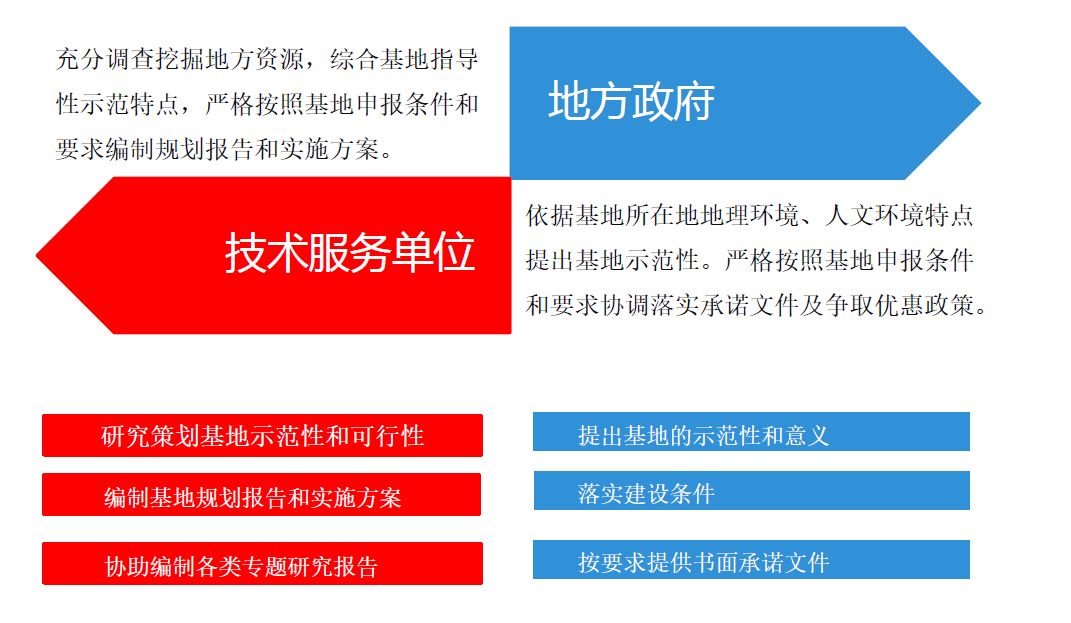 基地策划申报涉及两方,地方政府是主体实施方,技术服务单位配合地方政府。地方政府依据基地所在地地理环境、人文环境特点提出基地示范性。严格按照基地申报条件和要求协调落实承诺文件及争取优惠政策。技术服务单位充分调查挖掘地方资源,综合基地指导性示范特点,严格按照基地申报条件和要求编制规划报告和实施方案。示范性对于基地申报很重要,前几批基地实施上都严格按照基地申报条件和要求协调落实好承诺文件和争取到优秀政策,第三批也将比前两批有较大的进步。