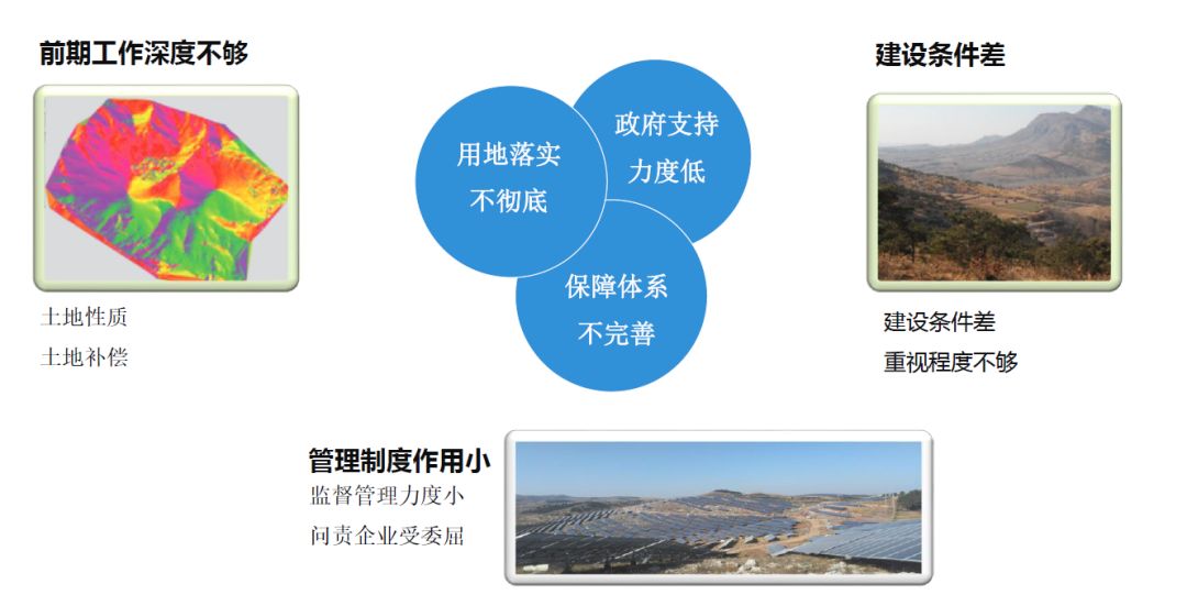 唐晓峰表示,根据前两批及目前在实施的第三批领跑者项目看,第三批领跑者项目中的有利条件一方面,申报时明确了承诺文件,有利于降低投资企业非技术成本,另一方面,成立了领导小组,基地办公室或平台公司等,并承诺按照责权一致的原则,建立有效的一站式综合服务体系,有利于基地顺利推进。目前最主要的问题在于用地上,而用地成本、消纳、单独招标、一站式服务的问题在第三批上相对前两批有了很大的改善。由于用地落实不彻底、政府支持力度低、保障体系不完善,造成土地性质建设条件差、土地补偿价格标准性差异大、监督管理制度力度小。
