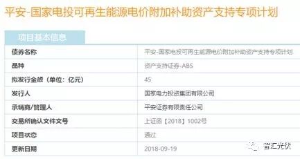 国家电力投资集团有限公司作为原始权益人的“平安-国家电投可再生能源电价附加补助资产支持专项计划”获得上交所核发的挂牌转让无异议函。