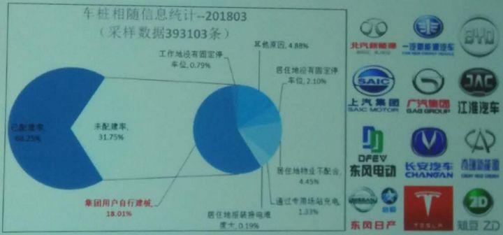 截至2018年3月,通过联盟内成员整车企业(比亚迪、上汽、北汽、江淮、特斯拉、长安、吉利、奇瑞、东风电动、东风日产、广汽、一汽、知豆)采样车桩相随信息数据393103条,其中建设安装私人类充电桩268282个,整体未配建率约31.8%,其中约18%是由于集团用户采购纯电动轿车作为出租车、分时租赁用车等运营专用车辆而不需要车企随车配建充电设施所致。另一方面,因私购车的充电桩配建约为83.2%。