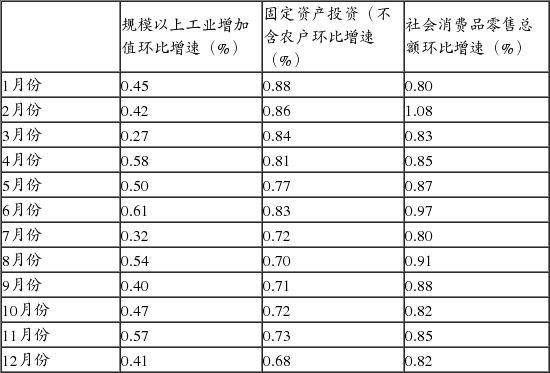 (3)根据季节调整模型自动修正结果,对近一年来各期国内生产总值、规模以上工业增加值、固定资产投资(不含农户)、社会消费品零售总额环比增速进行修订。修订结果及2015年四季度GDP环比数据、2015年12月份其他指标环比数据如下: