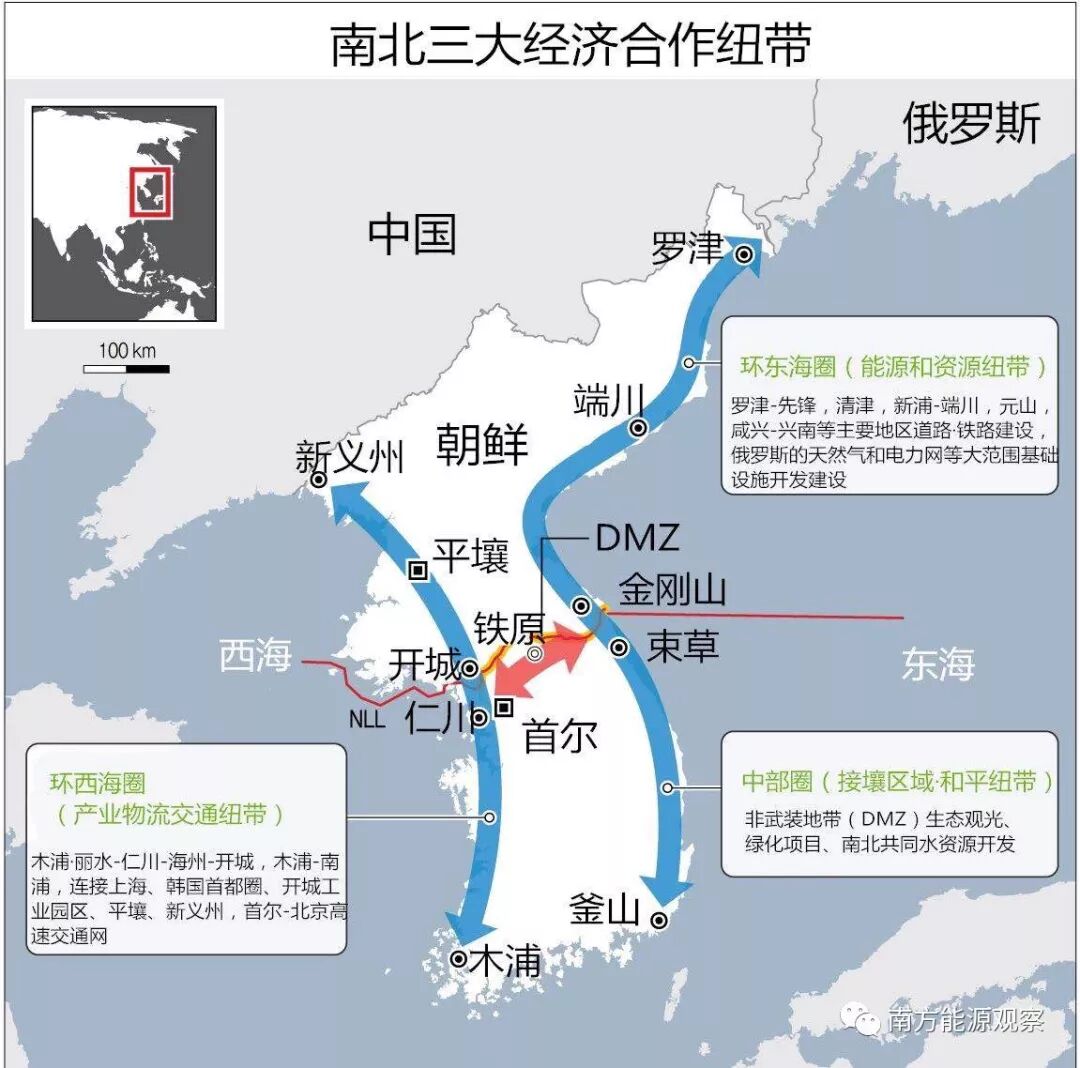 在提出“九桥战略”的同时,文在寅还提出了繁荣半岛经济的“新经济构想”,核心是建设半岛南北互通的“一个市场”。并通过建设“三大经济合作带”来促进南北的经济联。其中环东海圈属于能源与资源带,包括与俄罗斯建立在天然气和电力等基础设施领域的合作。