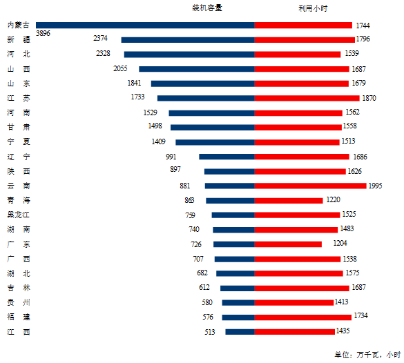 分类型看,1-9月份,全国水电设备平均利用小时为2794小时,比上年同期降低100小时。在水电装机容量排前10的省份中,除浙江外,其他省份水电设备平均利用小时均同比降低,其中,青海、广东和广西降低较多,分别降低584、281和240小时;全国火电设备平均利用小时为3339小时,比上年同期增加280小时,其中,燃煤发电设备平均利用小时为3450小时,比上年同期增加318小时,燃气发电设备平均利用小时为2074小时,比上年同期增加140小时。分省份看,全国有14个省份的火电设备利用小时超过全国平均水平,其中江西、内蒙古、福建和新疆超过3700小时,分别为3993、3778、3765和3723小时,甘肃、海南、浙江、广西、安徽和广东超过3500小时,而西藏仅为218小时。与上年同期相比,除吉林、内蒙古、黑龙江、河北、西藏和辽宁外其他省份火电利用小时均同比增加,其中重庆、浙江、广东、四川和青海增加超过700小时,分别增加801、755、727、727和723小时;全国核电设备平均利用小时5842小时,比上年同期增加321小时;全国并网风电设备平均利用小时1640小时,比上年同期增加91小时;全国太阳能发电设备平均利用小时1006小时,比上年同期降低4小时。