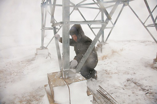 国网蒙东电力员工在暴风雪中紧固铁塔接地线螺栓。