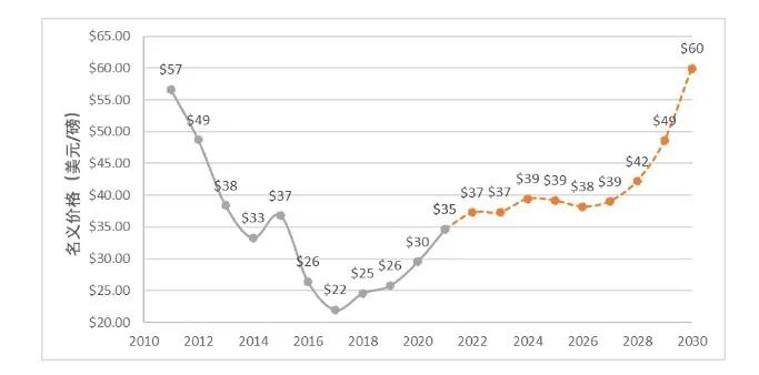 报告还对2022-2030年天然铀现货价格作了预测。之所以选择对长期现货价格进行预测,是因为该价格是反应市场供需关系的主要指标,是长贸协议引用的重要指数,且不易受到短期市场投机行为的影响。