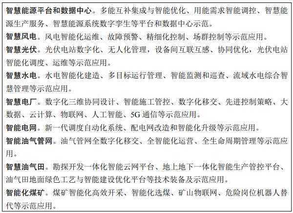 实施智慧能源示范工程。以多能互补的清洁能源基地、源网荷储一体化项目、综合能源服务、智能微网、虚拟电厂等新模式新业态为依托,开展智能调度、能效管理、负荷智能调控等智慧能源系统技术示范。推广电力设备状态检修、厂站智能运行、作业机器人替代、大数据辅助决策等技术应用,加快“智能风机”、“智能光伏”等产业创新升级和行业特色应用,推进“智慧风电”、“智慧光伏”建设,推进电站数字化与无人化管理,开展新一代调度自动化系统示范。实施煤矿系统优化工程,因地制宜开展煤矿智能化示范工程建设,建设一批少人、无人示范煤矿。加强油气智能完井工艺攻关,加快智能地震解释、智能地质建模与油藏模拟等关键场景核心技术开发与应用示范。建设能源大数据、数字化管理示范平台。
