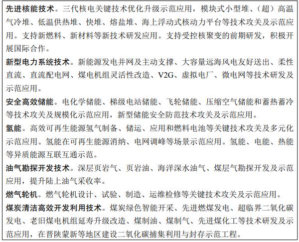 实施科技创新示范工程。依托我国能源市场空间大、工程实践机会多等优势,加大资金和政策扶持力度,重点在先进可再生能源发电和综合利用、小堆及核能综合利用、陆上常规和非常规及海洋油气高效勘探开发、燃气轮机、煤炭清洁高效开发利用等关键核心技术领域建设一批创新示范工程。瞄准新型电力系统、安全高效储能、氢能、新一代核能体系、二氧化碳捕集利用与封存、天然气水合物等前沿领域,实施一批具有前瞻性、战略性的国家重大科技示范项目。