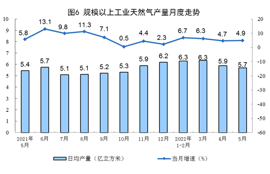 天然气生产保持稳定,进口降幅收窄。5月份,生产天然气177亿立方米,同比增长4.9%,增速比上月加快0.2个百分点,日均产量5.7亿立方米。进口天然气907万吨,同比下降12.1%,降幅比上月收窄7.5个百分点。
