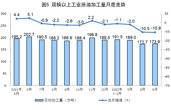 原油加工量继续下降。5月份,加工原油5392万吨,同比下降10.9%,降幅比上月扩大0.4个百分点,日均加工173.9万吨。1—5月份,加工原油27716万吨,同比下降5.3%。