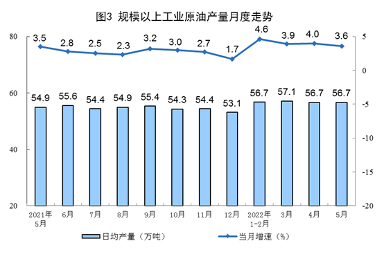 原煤生产保持较快增长,进口由增转降。随着煤炭保供稳价政策深入推进,原煤生产继续保持较快增长。5月份,生产原煤3.7亿吨,同比增长10.3%,增速比上月放缓0.4个百分点,日均产量1187万吨。进口煤炭2055万吨,同比下降2.3%,上月为增长8.5%。