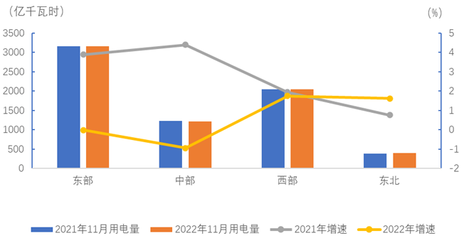 11月份,东、中、西部和东北地区全社会用电量增速分别为-0.02%、-0.9%、1.8%和1.6%。