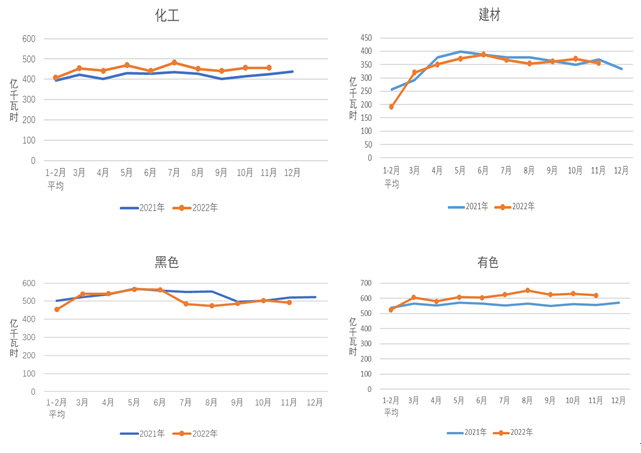 1-11月,化工行业用电量4977亿千瓦时,同比增长5.1%;建材行业用电量3688亿千瓦时,同比下降3.3%;黑色金属冶炼行业用电量5580亿千瓦时,同比下降5.0%;有色金属冶炼行业用电量6796亿千瓦时,同比增长3.0%。