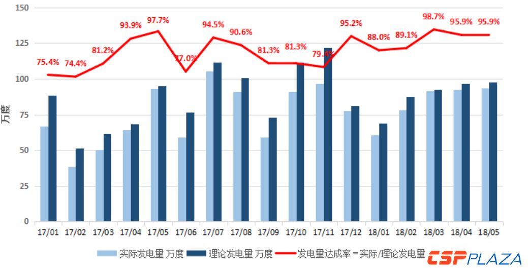 各位下午好!接下来,我想同在座的各位分享一下青海中控德令哈50MW塔式光热发电示范项目建设的一些体会和10MW电站运营的一些感受。 青海中控德令哈50MW塔式光热发电示范项目于2016年10月份开工建设,预计到今年年底能够并网发电。该项目技术、工程承包商均为浙江中控太阳能技术有限公司,总投资为11.3亿元,静态投资为10.88亿,年发电量1.46亿度,资本金收益率为12.8%。 关于项目的主要技术参数:德令哈的光资源比一般地方要好一点,DNI为2043kWh/㎡,去年的实测数据为2002kWh/㎡;项目占地面积为2.47km²,总采光面积为542700㎡,吸热器额定热功率为230MWt,储热容量为869MWh,储热时间为7.2小时,汽轮机额定功率为50MWe。 关于项目的设计:项目设计单位中国电力工程顾问集团西北电力设计院是非常权威的设计单位,同时中控太阳能也参与了一些核心工作。在设计进度方面,2016年12月份做了补充可研编制;2017年2月份做初步设计;2017年6月份完成初步设计;2017年8月份完成吸热塔上部结构施工图设计。整体而言,初步设计周期为4个月,详细设计周期为14个月。由于首次做这样的设计,因此要留有足够的余量。当然,随着项目经验的不断积累以及设计的标准化,项目整体的设计时间可以由18个月缩短到8个月。 镜场由中控太阳能公司承建,共计27135台定日镜,包含1套控制系统,4辆清洗车,镜面清洁周期为每周清洗一次(德令哈的空气比其它地方干净一点)。 关于定日镜的主要参数:工作风速为16m/s以下,最大的生存风速为37m/s,工作温度为-40℃至65℃,防护等级为IP65,工作海拔在5000m,寿命长30年,反射率为0.94,年故障率为0.3‰(故障率非常低)。 关于定日镜组装车间:采用全自动生产线,占地面积2400㎡,每条生产线每天产量为150套,相当于3000㎡的生产能力,如果采用2条生产线,每天的生产能力就可达到6000㎡。 关于镜场进度和定日镜安装进度:截至6月10日,完成立柱安装20473根,累计完成75%,预计7月中旬可以安装完毕;定日镜已安装11170面,累计完成42%,预计9月中旬可完成所有定日镜的安装。班组安排情况为:立柱安装4人,定日镜组装人数6人。 吸热器是由杭州锅炉集团股份有限公司设计的,直径为12.14m,高度为15.03m,设计效率为90%,吸热屏数量为32片,预计6月底可完成22片工厂制造,10月份能够完成安装和调试。 储换热系统进度相对有点耽误:2017年7月储罐基础开工,2017年9月完成混凝土基础,预计今天7月份换热器到货,8月份熔盐泵到货,10月份开始化盐,11月份开始调试。目前,汽轮机已经制造完毕,等待发货。 令人遗憾的是,受气温影响,2017年12月至2018年3月项目施工暂停。去年由于经验不足,未能在冬季来临之前完成吸热塔施工,致使4个月的时间没能利用起来,有点耽误项目进度。由于我们在去年11月份的时候没有按期完工,耽误了两个月的时间,因此,到今年5月下旬才完成吸热塔施工。 总体来看,项目在今年年底实现并网发电的可能性还是比较大的,所谓可能性就是不能完全保证,需要留意一些意外情况的发生,毕竟在当今社会,意外情况时有发生,诸如环保问题等等,都可能会带来一些影响,但是目前还没有发生会影响项目按时并网发电的大事情。 对于如何缩短项目建设工期,一直是大家非常关注的话题,而我们在这方面也有很多体会。目前,光热电站的建设周期约为2年,压缩建设周期有利于提升电站的投资回报率,降低度电成本,这点大家都很明白。 那么,如何缩短建设周期呢?我认为,第一个影响因素是设计。目前,从初步设计到详细设计要花费18个月的时间,而通过技术路线的定型、设计的标准化和可复制性的提升,我相信第二、第三个电站的设计周期可以大幅度缩短,预计设计周期可以缩短到8-10个月。 第二个影响因素是混凝土施工。在中国西部地区特殊的气候环境下,冬季温度很低,要进行混凝土浇筑施工是非常困难的,约有4个月的时间要暂停施工,因此,我们要考虑如何在可以施工的时间段内里完成土建浇铸施工,同时,在冬季我们可以开展室内安装调试工作。一般来说,吸热塔的建设周期为6个月,考虑到冬季无法施工,因此最好在3、4月份启动建设,在11月份之前完成这项任务。这样,我们就可以对11月份到次年3月份这4个月时间进行合理安排。 除此之外,由于部分设备供货周期很长,比如吸热器、换热器、熔盐泵及汽轮机等大约需要12个月的时间到货,这也会影响项目建设周期。如果我们选用国外生产的汽轮机,可能需要15个月的时间到货,若想缩短时间,不能期望老外为我们加班加点,倒是中国人加班加点是常事,你可以有所期待。因此,只有通过设备定型、生产过程的标准化、模块化以及原材料批量采购,可以大幅度缩短供货周期,也可按照连续建设几个电站的要求提前下单;如果每个项目均按照工程节点单独下单,那么12个月的制造周期是省不出来的,反之可以大幅度缩短长周期设备的生产时间。 我们相信,未来随着光热设备的定型、设计及生产标准化程度的提升,设计院、制造厂商和施工单位也会积累丰富的经验,光热电站建设周期可以缩短至1-1.5年(我们认为1年之内的可能性是不存在的)。 在接下来的时间里,我想就中控德令哈10MW项目运行的体会跟各位分享一下。下图显示的是从2017年1月至2018年5月,10MW电站的理论发电量和实际发电量统计情况,这些数据囊括了所有影响发电量的因素,即天气原因、运营经验和设备故障(